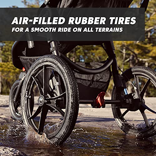 Nylon Imported Patented quick fold technology fold your stroller with one hand 3 Wheel Stroller: 16" rear and 12" front air filled tires with front wheel lock mounted on the handlebar for easy conversions between jogger and stroller mode All wheel suspension system soaks up road bumps making it the perfect all terrain stroller Hand operated rear brakes for more control on hilly or uneven terrain Large adjustable sun canopy with peek a boo windows and side vents Patented quick fold technology fold your stroller with one hand 16" rear and 12" front air filled tires with front wheel lock mounted on the handlebar for easy conversions between jogger and stroller mode All wheel suspension system soaks up road bumps Hand operated rear brakes for more control on hilly or uneven terrain Large adjustable sun canopy with peek a boo windows and side vents