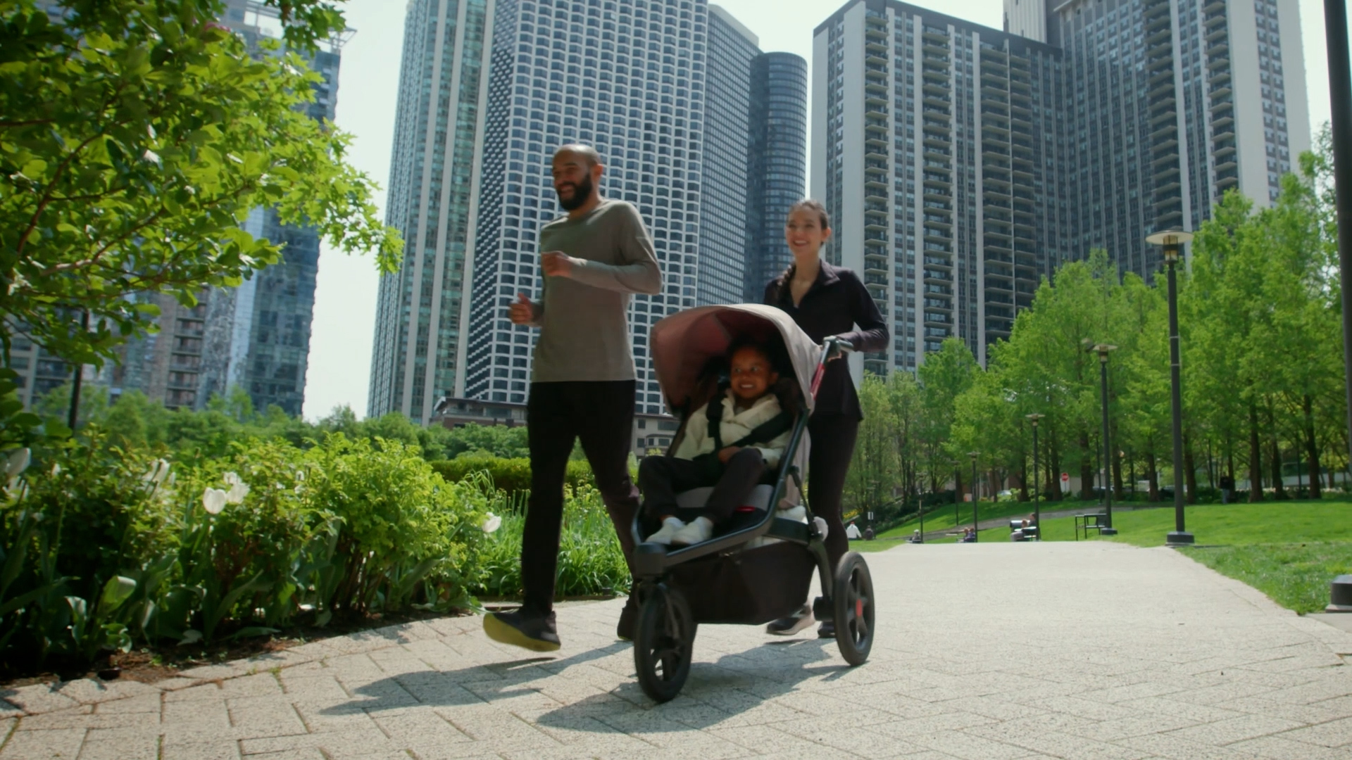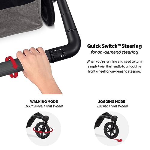 QUICK SWITCH STEERING: The Momentum Jogging Stroller features Quick Switch Steering, allowing you to easily unlock or lock the 12” front swivel wheel by simply twisting the handlebar. The front wheel is unlocked in walk mode and locked in run mode. The stroller handlebar is height adjustable and features a comfort grip and a wrist strap for added safety while jogging.