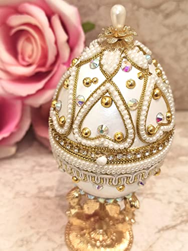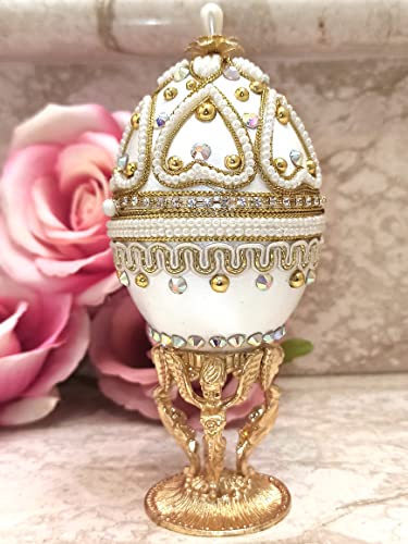 💖Keepsake Fabergé Egg Angel Imperial Egg Handcrafted -Authentic Natural Egg Faberge style -24kt GOLD embellished Hand designed Holy Trinity Guardian Angels Family Protection box. 5ct Austrian Crystal Diamonddiamonds & 500 Pearls Individually Hand set - Exquisite Hearts 24k Gold decor Musical Faberge style egg "Castle in the sky" .Artistically Hand Carved Faberge egg style . Christian Religious Protection box. White Natural Goose egg hand decorated -15.2cm x 7cm x 7cm approx.(6"x2.75"x2.75")