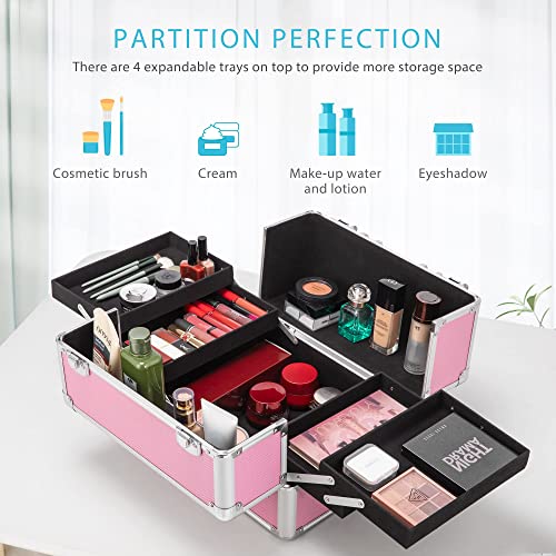 PACKAGE INCLUDES - 1* 4 in 1 Makeup Rolling Train Case Aluminum Professional Cosmetic Organizer Box; 1* Industrial Vanity Set with 3-Color Lighted Mirror and Acrylic Makeup Organizer FREE COLLOCATION - The top layer can be used separately as a small makeup train case; The 2nd layer has the same size as the 3rd layer, and there is a partition organizer that can be put into any of the middle layers for you to store jewelry, earrings, and necklaces, keeping your makeup well-organized; The middle layers can be removed to change this 4-in-1 makeup case into a 3-in-1 or 2-in-1 case according to your requirements 3 MOVING METHODS - Equipped with 4 360-degree caster wheels and a retractable pull handle for easy push and pull during a journey; By unlocking the safe buckles between the first layer and the second layer, you can change the big trolley into a portable suitcase, which is suitable for a short trip; The handle on the top and a shoulder strap are designed for you to lift the top case or carry it on your shoulder 3-COLOR DIMMING MIRROR - The high-quality LED lights around the mirror have 3 colors to switch: natural light (4500K), warm light (3000K), and cold light (6000-7000K) for your different makeup needs; You can design different makeups for various occasions, including shopping, outdoor activities, dating, and so on SENSITIVE SYSTEM - Different from the traditional mechanical key-type switch, it is designed with a touch sensor to control the brightness of the light; This design reduces wear and tear, reduces maintenance costs, and has a longer service life; With a waterproof button, you can safely clean this mirror when it is needed