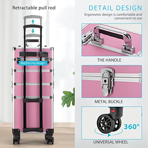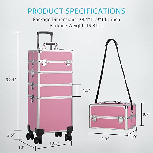 VIVOHOME 4 in 1 Makeup Rolling Train Case Aluminum Trolley Professional Cosmetic Organizer Box, Industrial Vanity Set with 3-Color Lighted Mirror and Acrylic Makeup Organizer