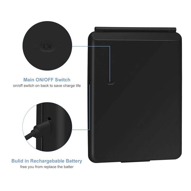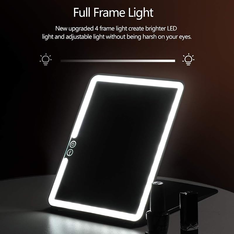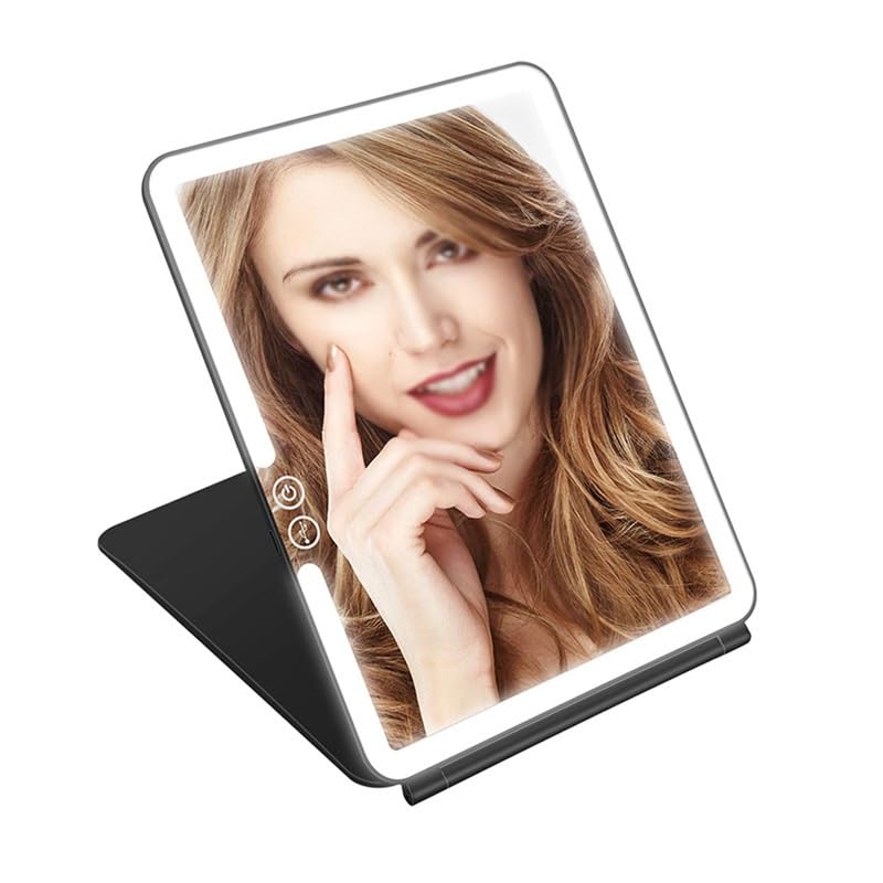 Circular light guide provides gentle eye protection. Multi angle adjustment for stable support. Long lasting without any constraints. Folding storage does not take up space. High definition details are right in front of us. 360 degree rotating double-sided mirror for placing on vanity or countertop mirrors ideal for up-close grooming, makeup application, skincare, and more