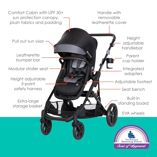 100% Polyester A versatile Single-to-Double Modular Stroller Travel system with multiple Forward and Rear facing configurations for a personalized strolling experience; Over 25 unique riding modes! The stroller frame includes a built-in standing board and seat bench, allowing two children to ride at the same time Includes a modular stroller seat that easily converts to a bassinet for a restful and comfortable option for baby The footrest on the stroller seat adjusts for your growing child to ensure extended use Integrated adapters allow the Morph to easily convert to a double stroller with many riding possibilities for your growing family