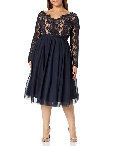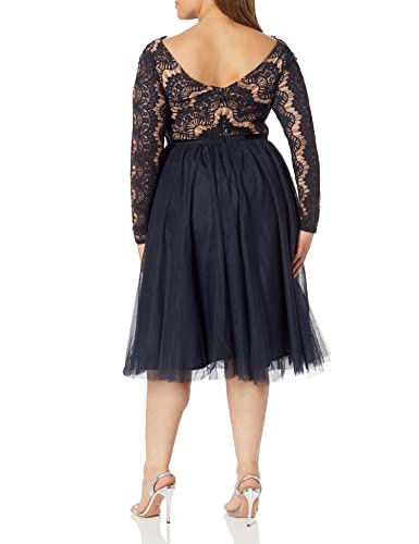 Dress the Population Women's Corey Plunging Mix Media Cap Sleeve A-line Midi Dress
